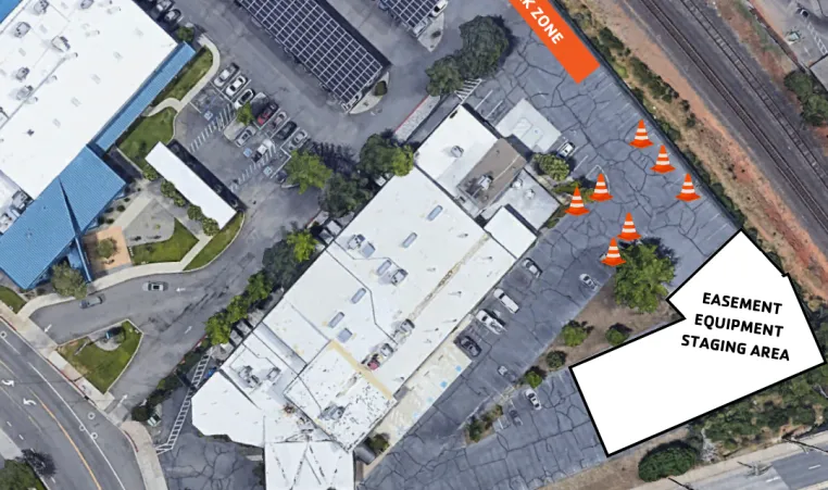 Contractors have begun staging their equipment in the southeast corner of the Y South parking lot (see photo) and it will remain for the duration of the project. Beginning next week, workers will need access to the bore pit in the back of our parking lot between Y Main and Y South. They will block off additional parking spots surrounding the bore pit so they have space for their equipment. See the orange work zone in the photo.